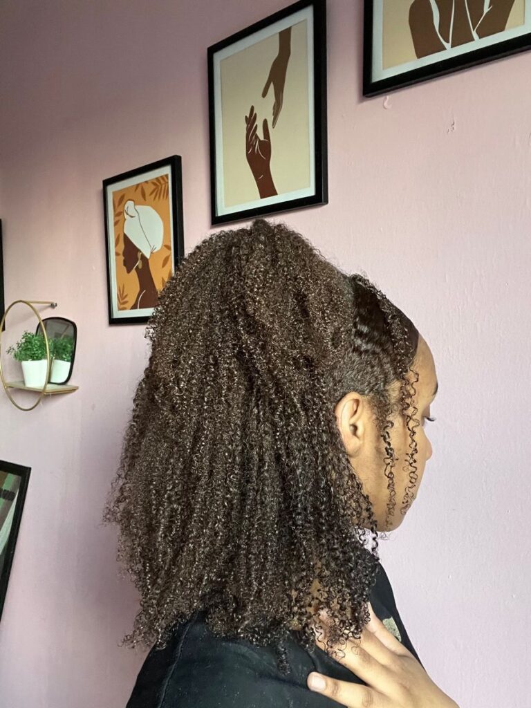 Cette technique, souvent vue comme rĂ©servĂ©e Ă d’autres textures, permet pourtant aux cheveux crĂ©pus — mĂŞme fins — de rĂ©vĂ©ler toute leur beautĂ© : des boucles dĂ©finies, du volume, du mouvement, et une brillance Ă©clatante. En me documentant, en testant, en Ă©coutant mes cheveux, j’ai compris que le potentiel Ă©tait lĂ depuis le dĂ©but. Il ne restait qu’à le rĂ©vĂ©ler.